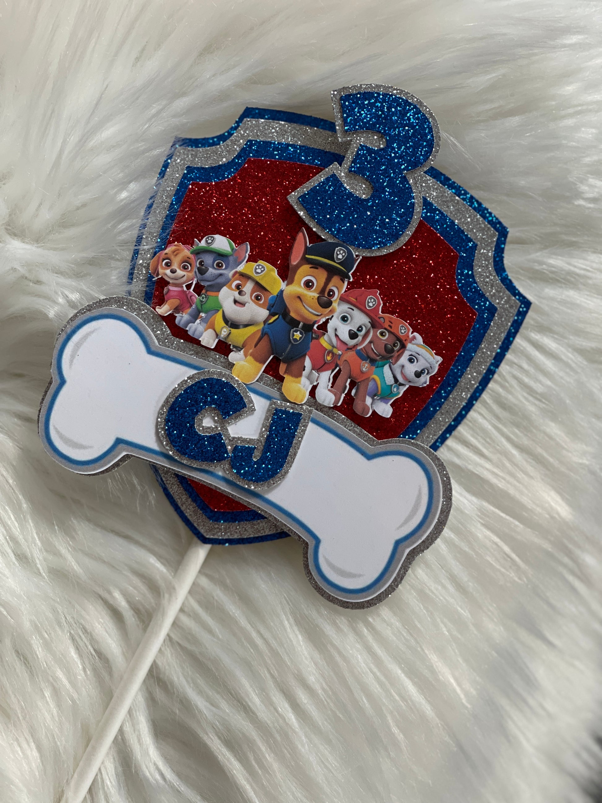 This custom cake topper is perfect for Paw Patrol-themed birthdays, featuring your child’s name and age for a unique touch. Made from high-quality materials, it adds the perfect finishing touch to your cake. Ideal for kids' parties, this topper is lightweight, durable, and easy to use.